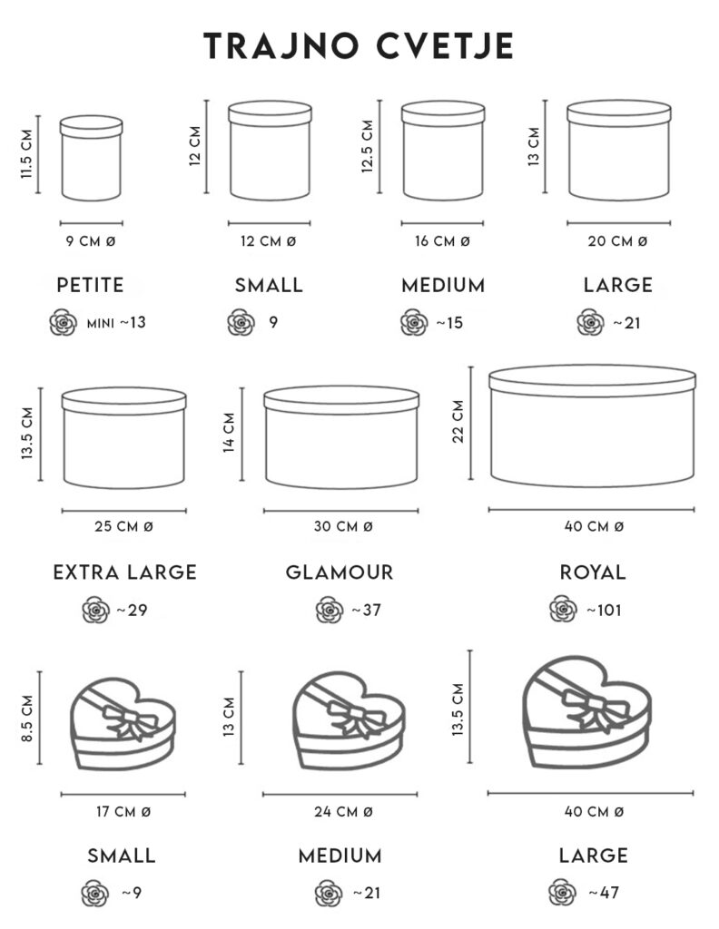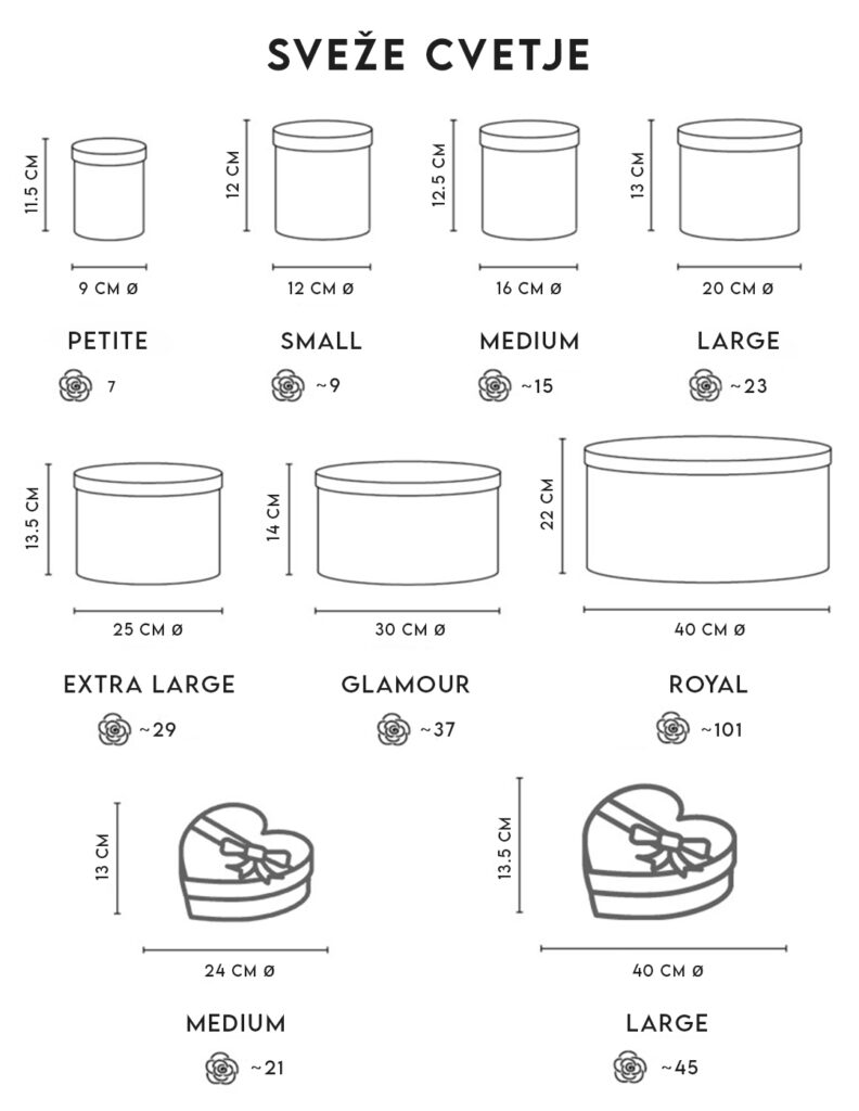 Menjave posameznih cvetov so možne zaradi sezonske razpoložljivosti, pri čemer vedno uporabimo primerne nadomestne cvetove enake vrednosti in stila.