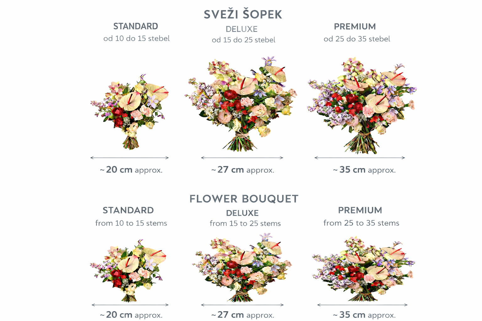 Menjave posameznih cvetov so možne zaradi sezonske razpoložljivosti, pri čemer vedno uporabimo primerne nadomestne cvetove enake vrednosti in stila.